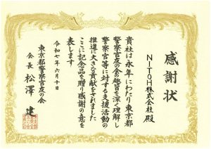 この度、弊社 NITOH株式会社は、長年にわたる地域社会への貢献、特に【警察友の会】を通じた活動が評価され、「感謝状」という大変栄誉ある賞を賜りましたことを、皆様にご報告させていただきます。